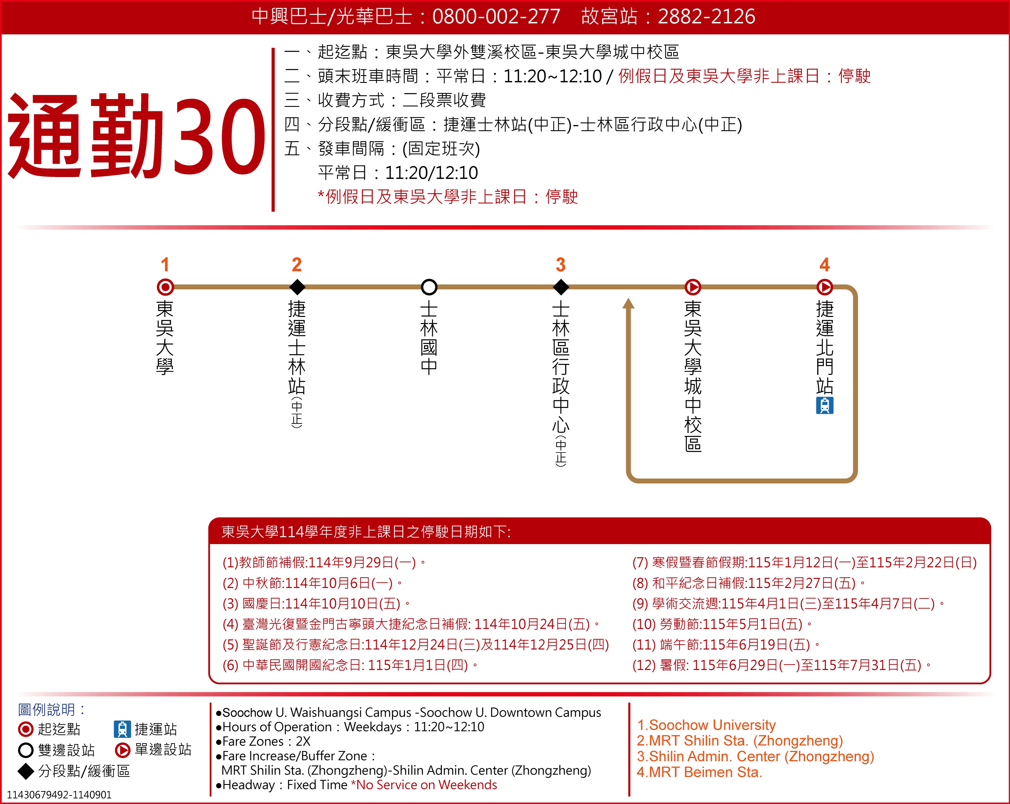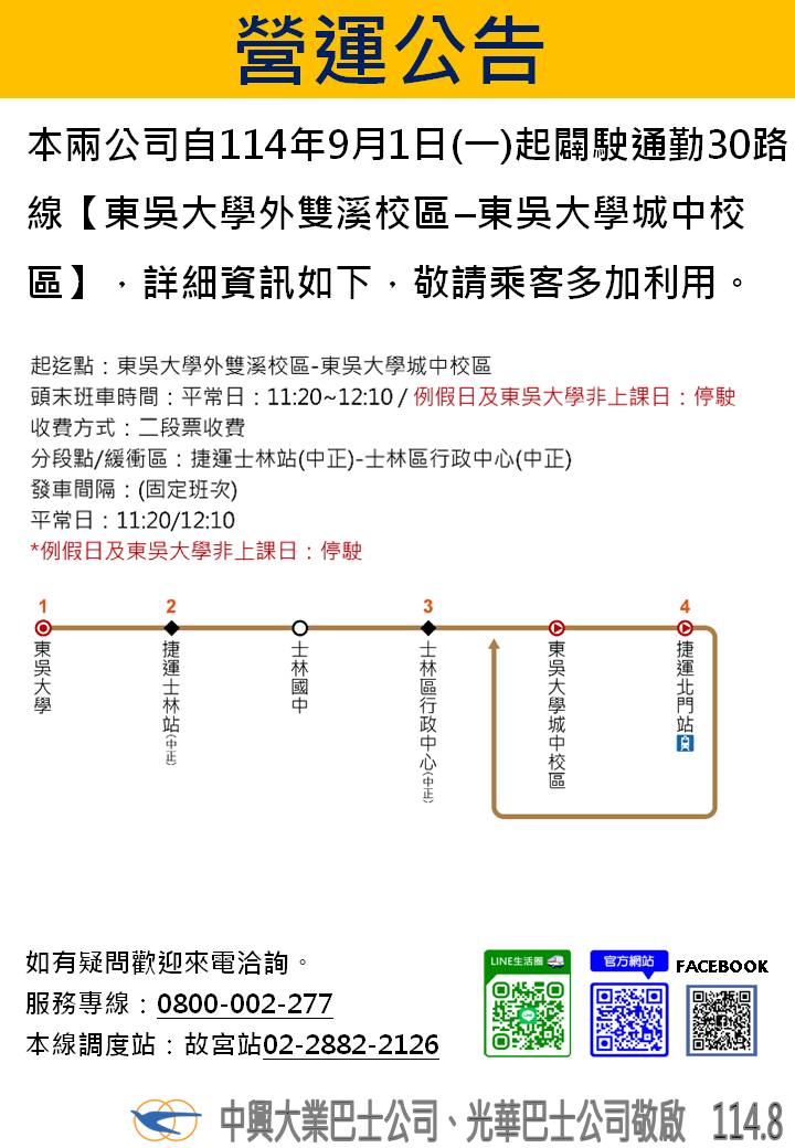 中興、光華自114年9月1日起新闢共營通勤30「東吳大學外雙溪校區-東吳大學城中校區」公告