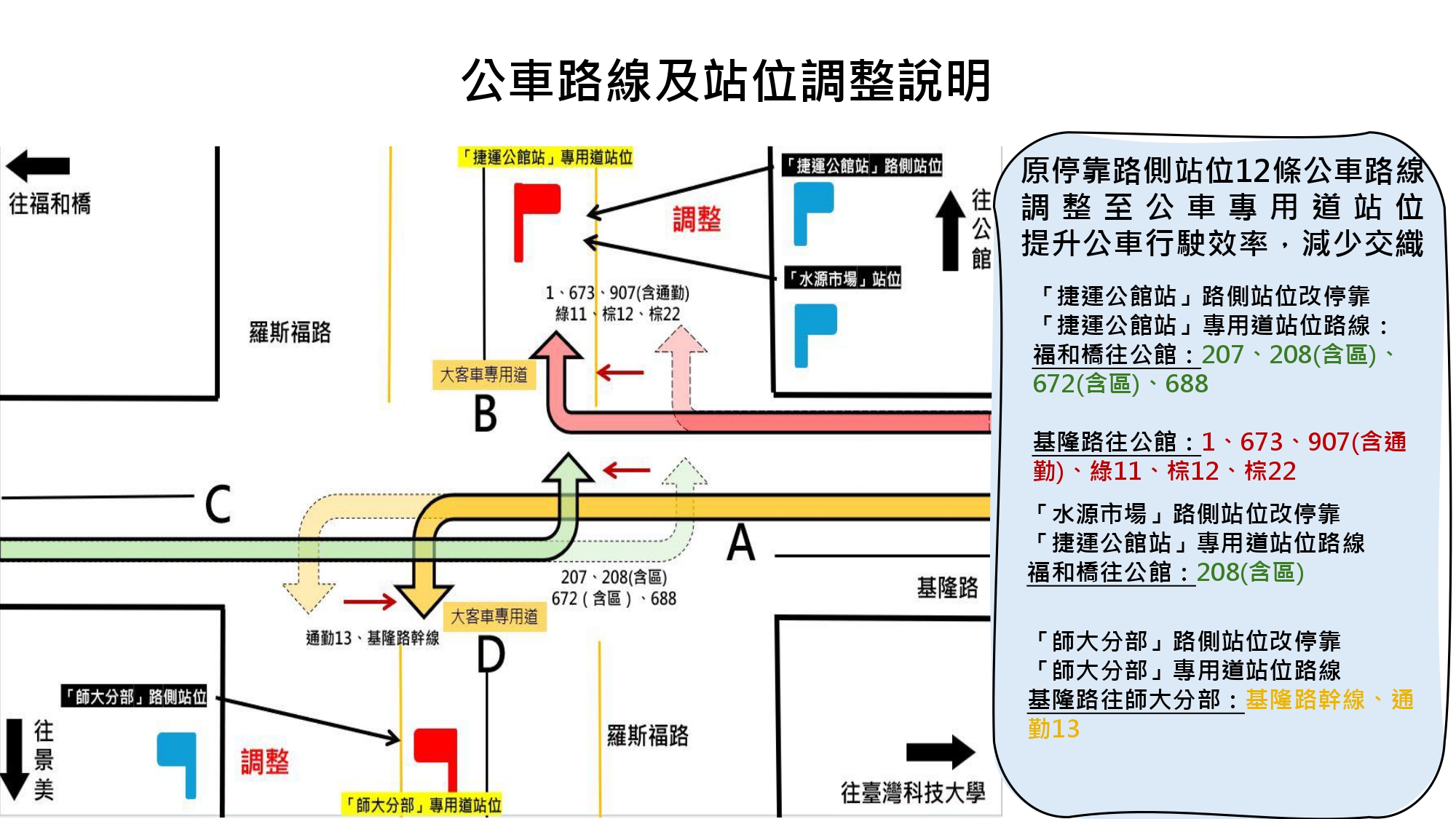原本路側的 "水源市場"、"捷運公館站" 往西站位(往程、往大直、公館方向站位) 請改至 公車專用道上"捷運公館站" 往西站位上下車