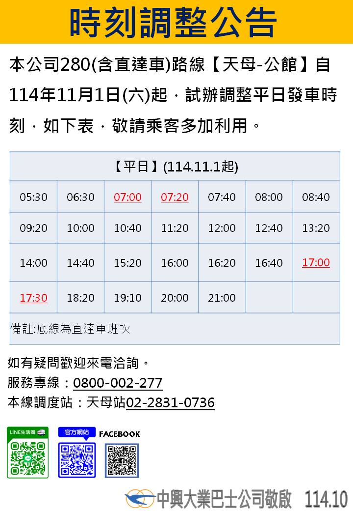 中興280(含直達車)路線自114年11月1日起,試辦調整平日發車時刻公告
