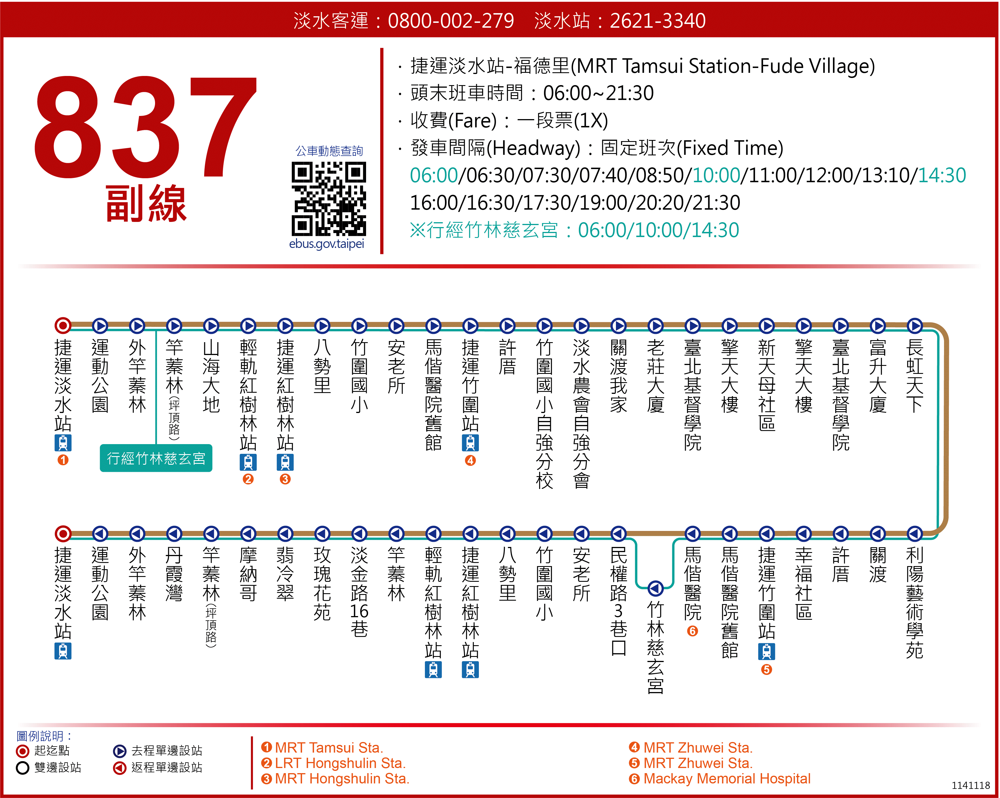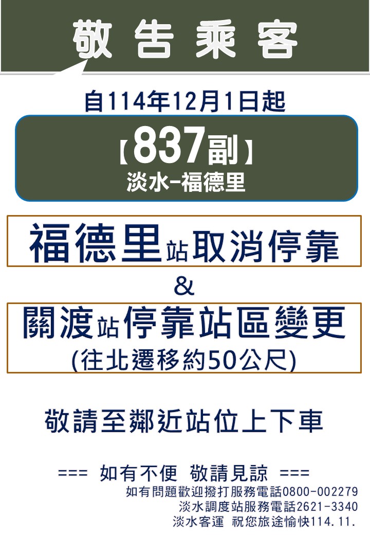 淡水客運【837副】線自114年12月1日起取消停靠「福德里」站