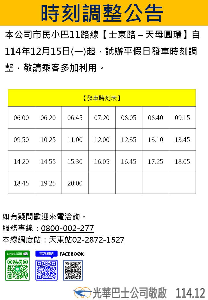 光華巴士市民小巴11線自114年12月15日起試辦調整發車時刻公告