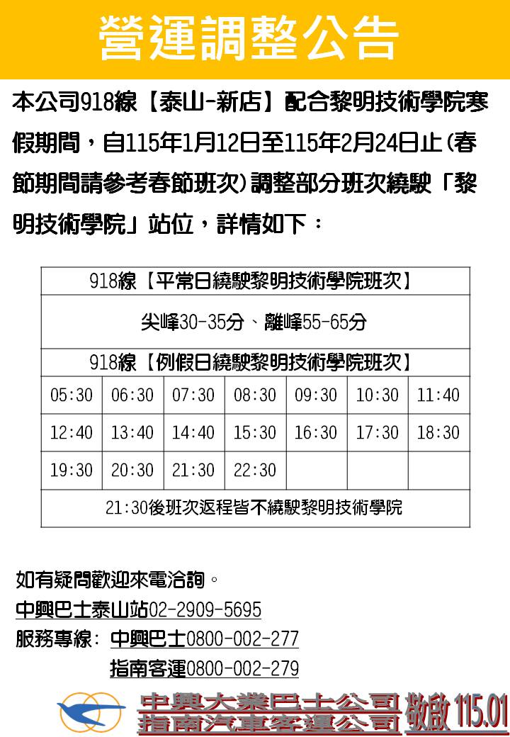 中興巴士/指南客運-918線於自115年1月12日起調整寒假期間繞駛黎明技術學院班次公告