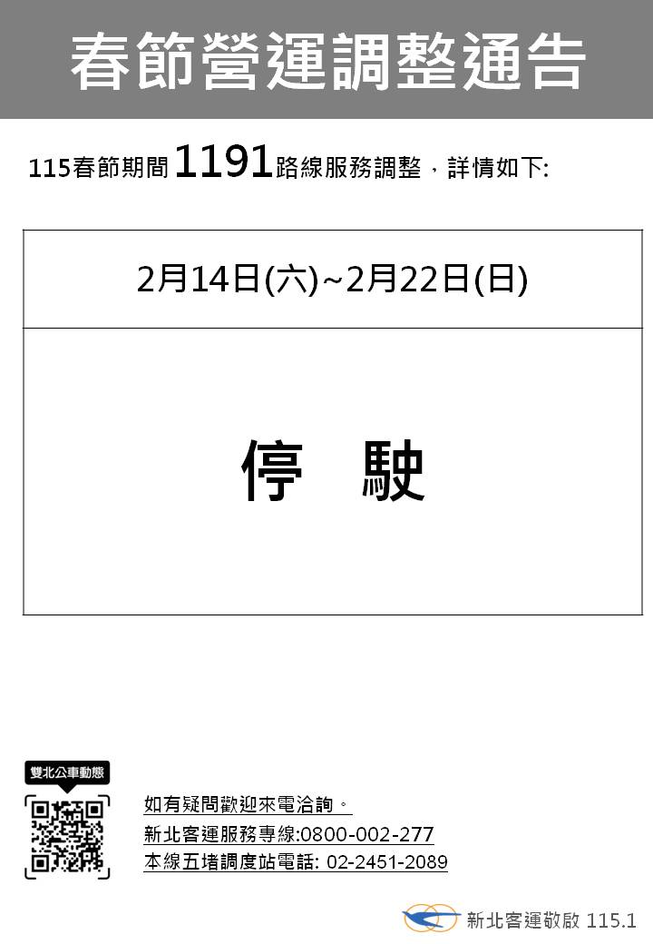 新北客運1191線115年春節期間(2/14-2/22)停駛公告