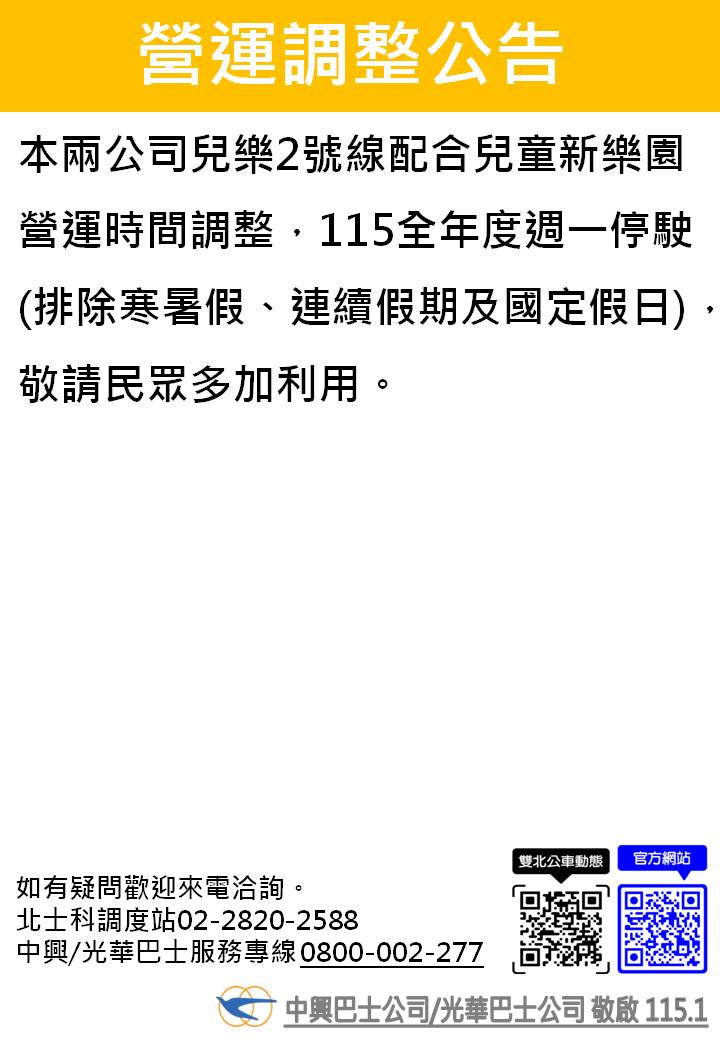 中興光華兒樂2號線配合兒童新樂園營運時間調整,115全年度週一停駛公告
