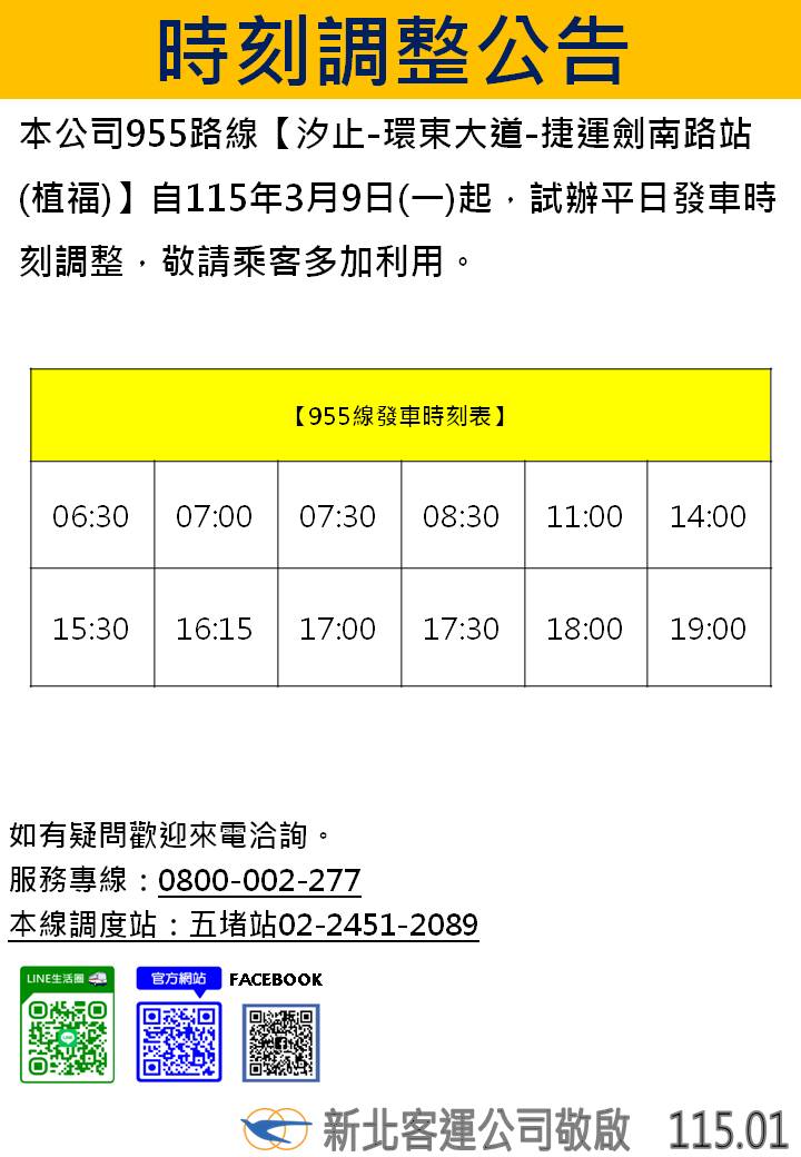 新北客運955路線自115年3月9日起試辦調整發車時刻公告