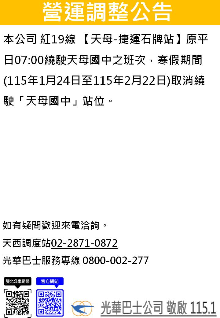光華巴士紅19路配合天母國中寒假期間平日0700班次取消繞駛「天母國中」站公告