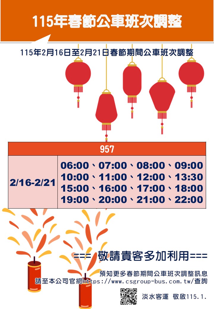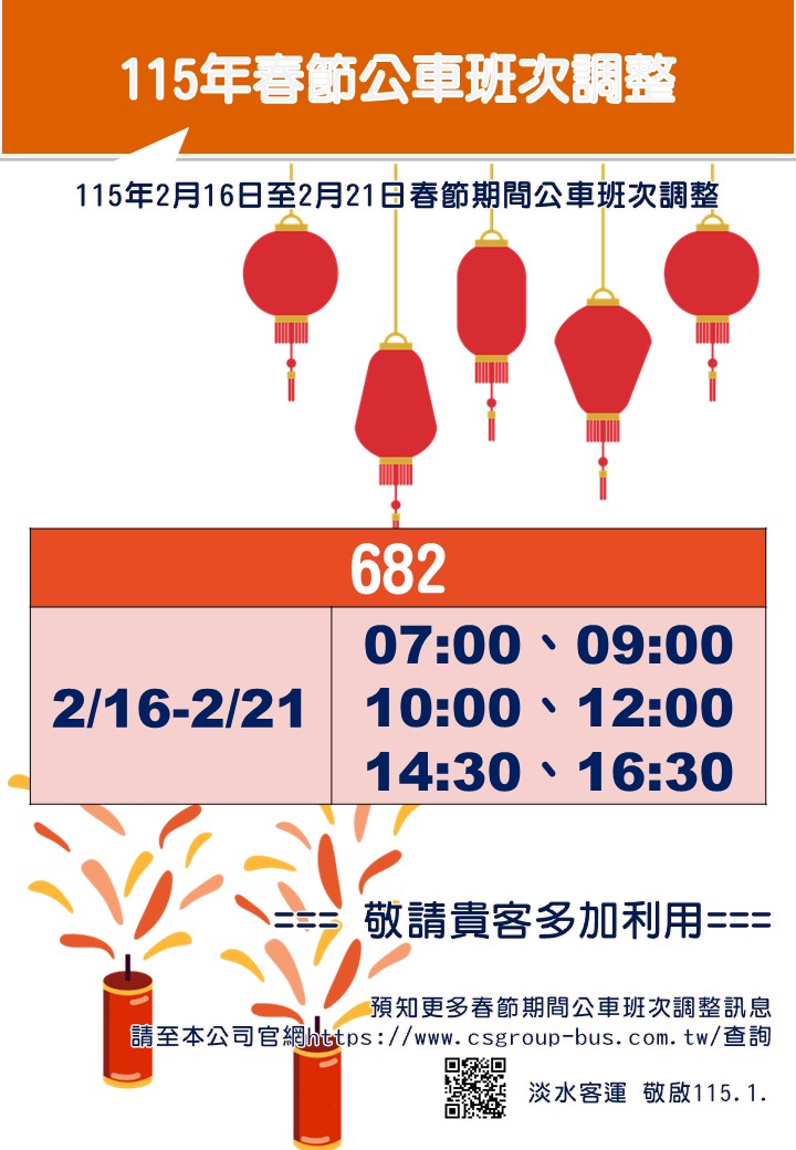 淡水客運115年春節連假期間682及957路線班次服務調整公告