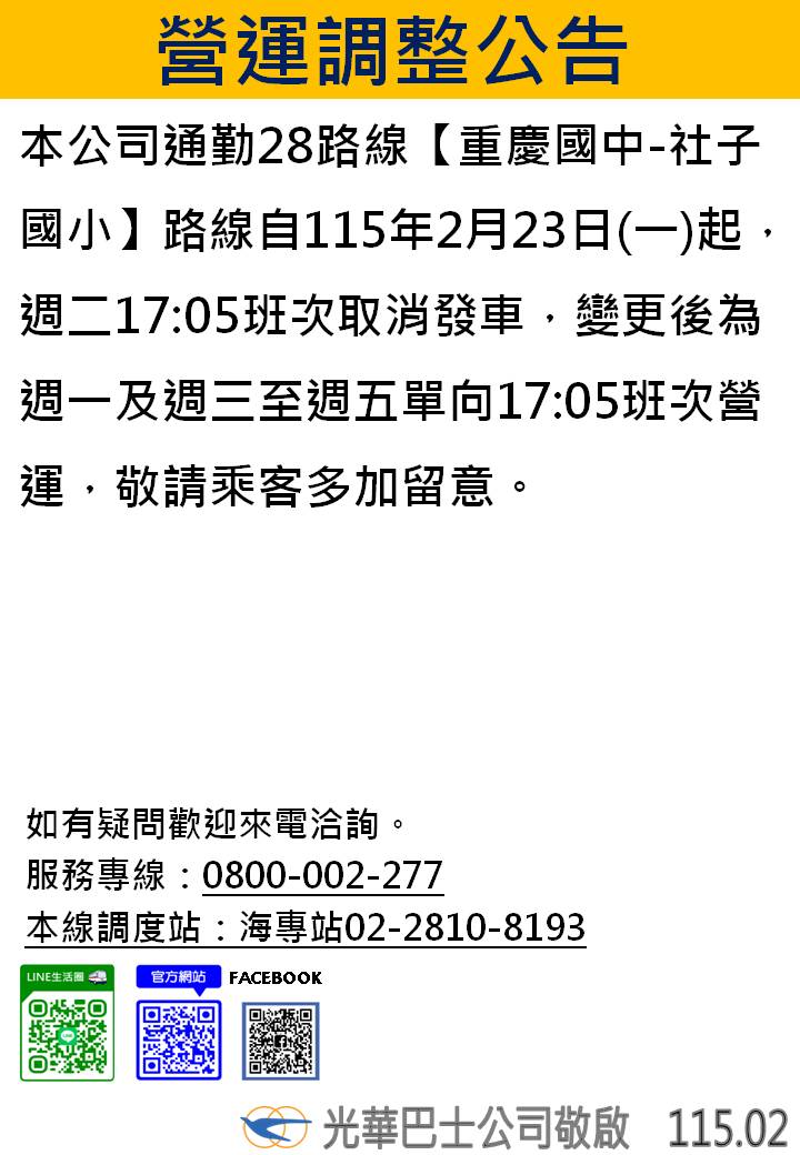 光華巴士通勤28路線自115年2月23日起取消周二1705班次公告