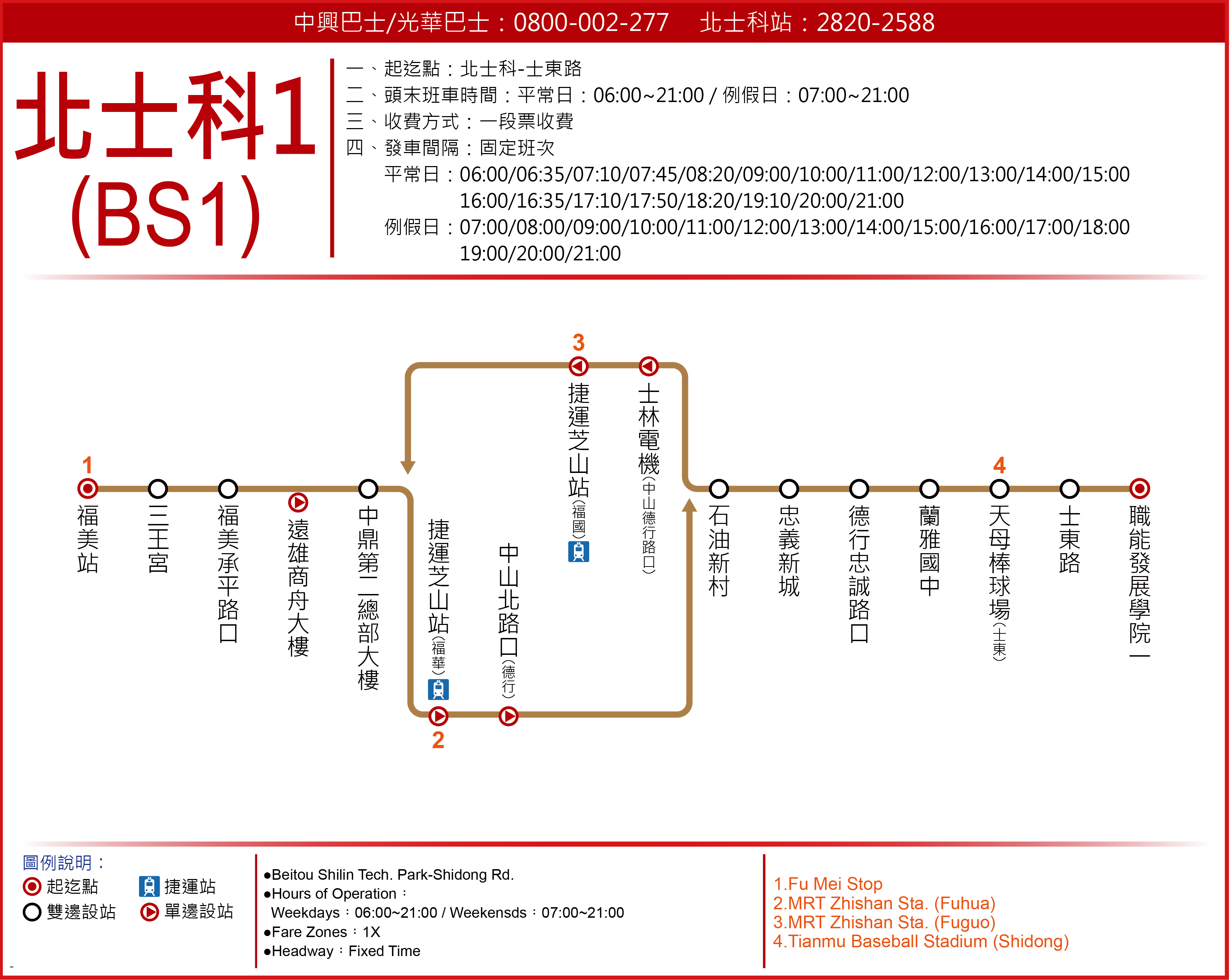 註2:北士科1路線往士東路方向之「捷運芝山站(福華)」站位,請至福華路126號(7-11超商前) 搭乘。