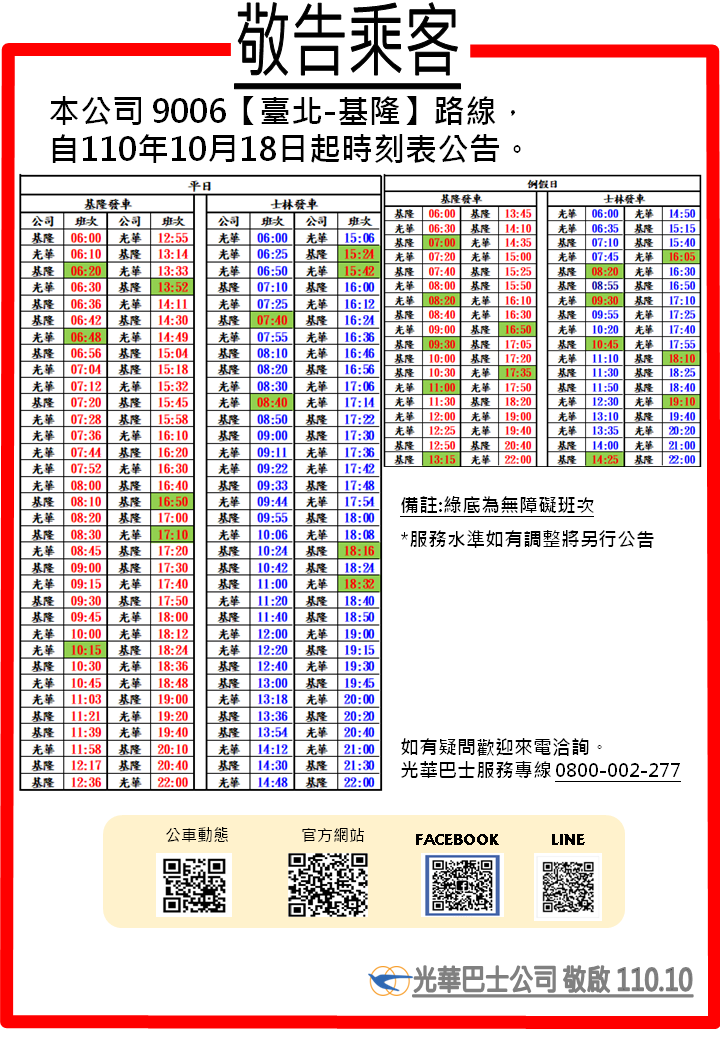 光華巴士【9006】路線於110年10月18日起因應載客需求調整時刻表